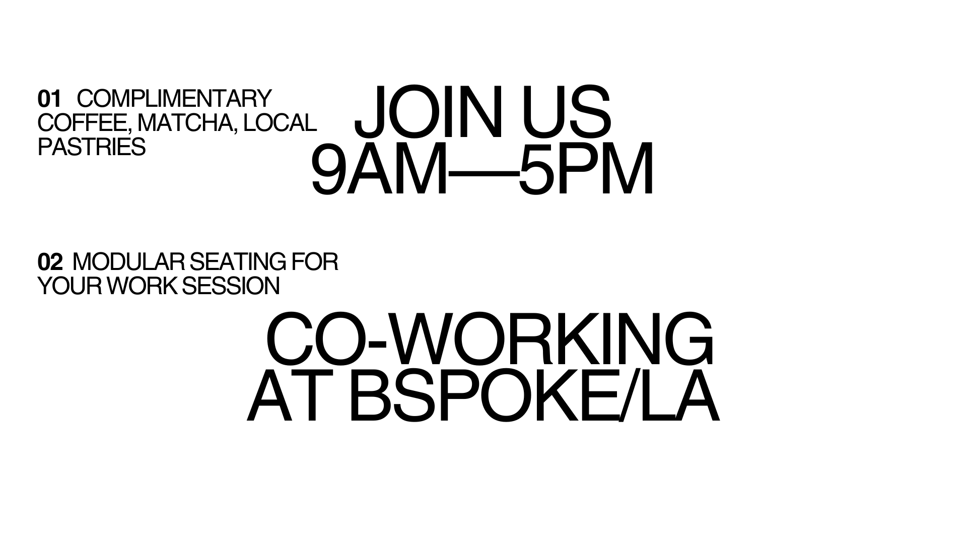 Each Wednesday from 9 AM–5 PM, BSPOKE/LA opens its doors for community coworking. For just $20, you’ll get access to a beautifully curated space at 439 N. Fairfax Ave, complete with coffee, matcha, pastries, content booths and more.